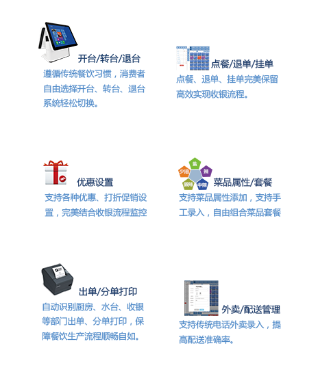 餐饮管理系统是琐碎而细致的,点餐、收银、会员、后厨、数据分析、O2O平台接入每个环节我们都悉心设置,严格遵循传统餐饮应用流程。