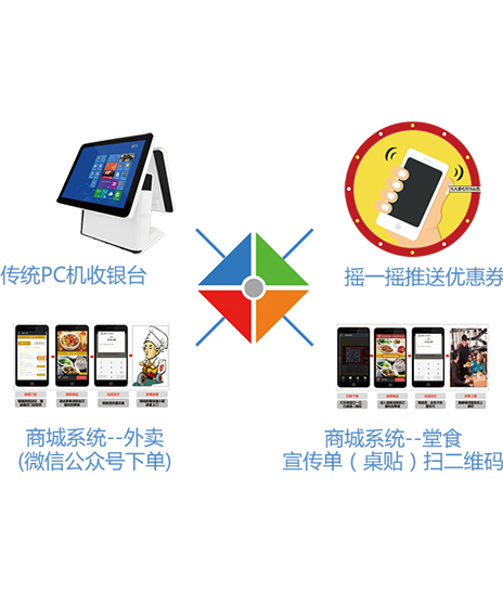 传统PC机收银台,微信商城外卖系统,餐厅内桌面扫码点餐。微信摇一摇参加活动。多种消费入口。